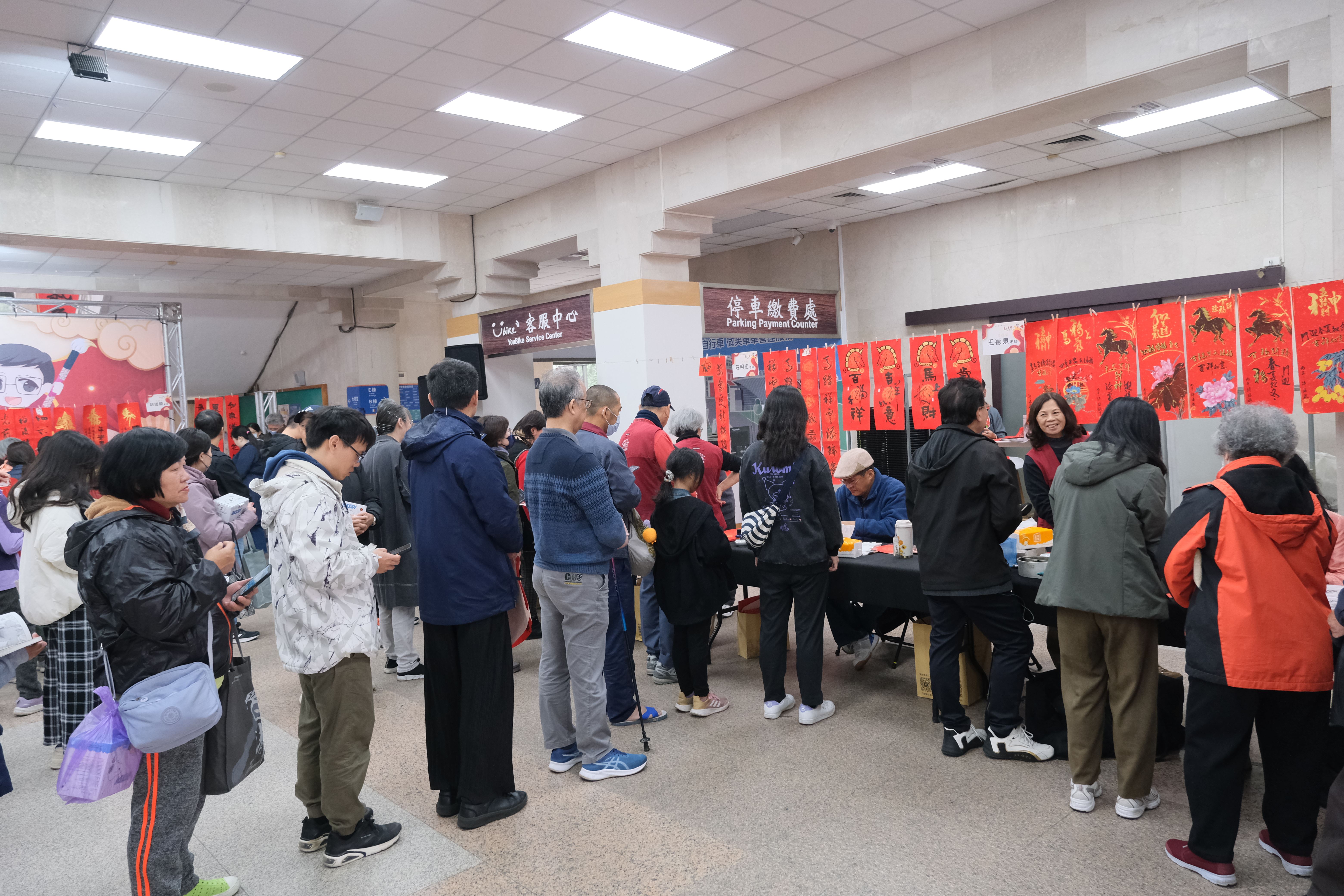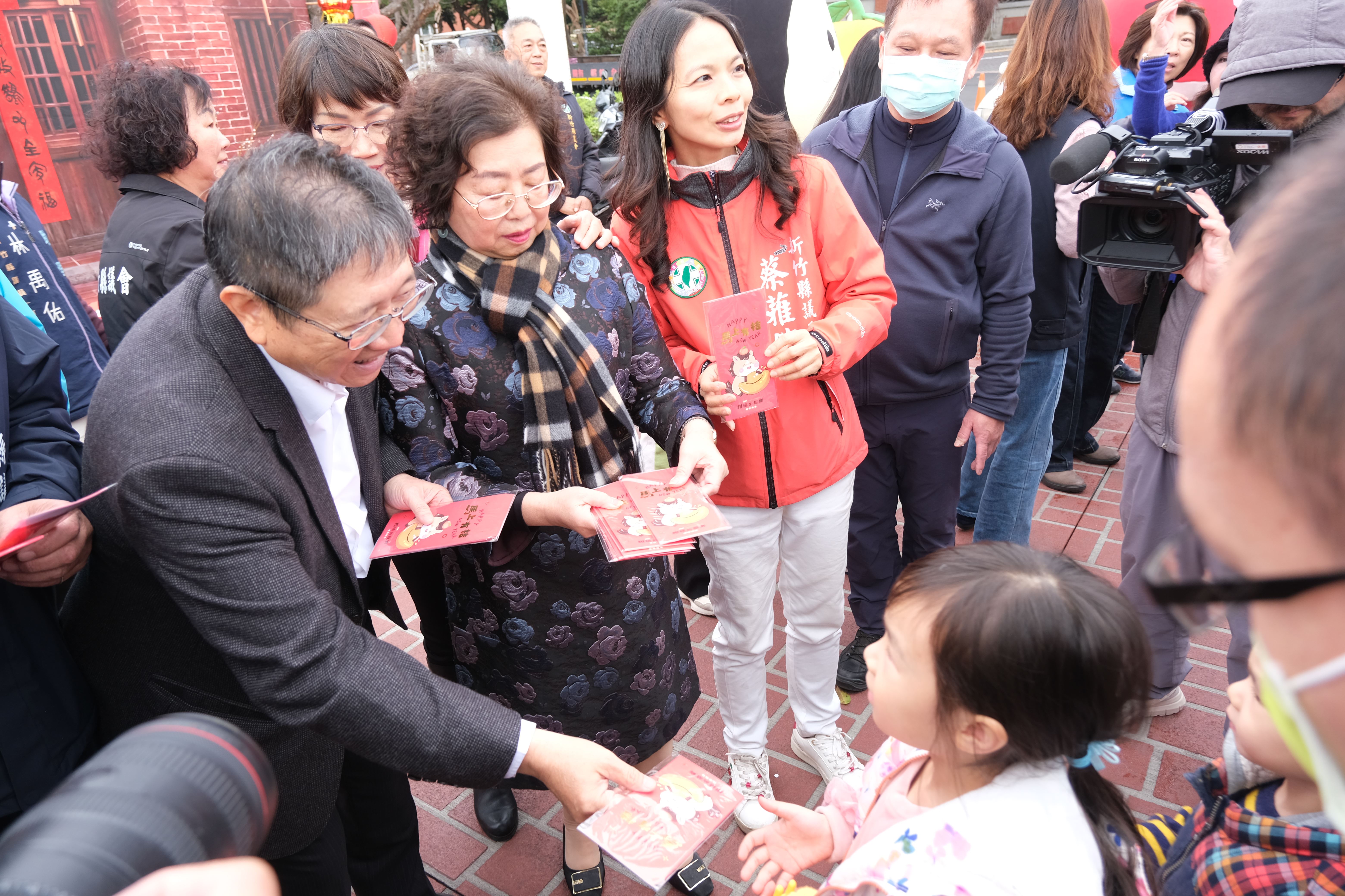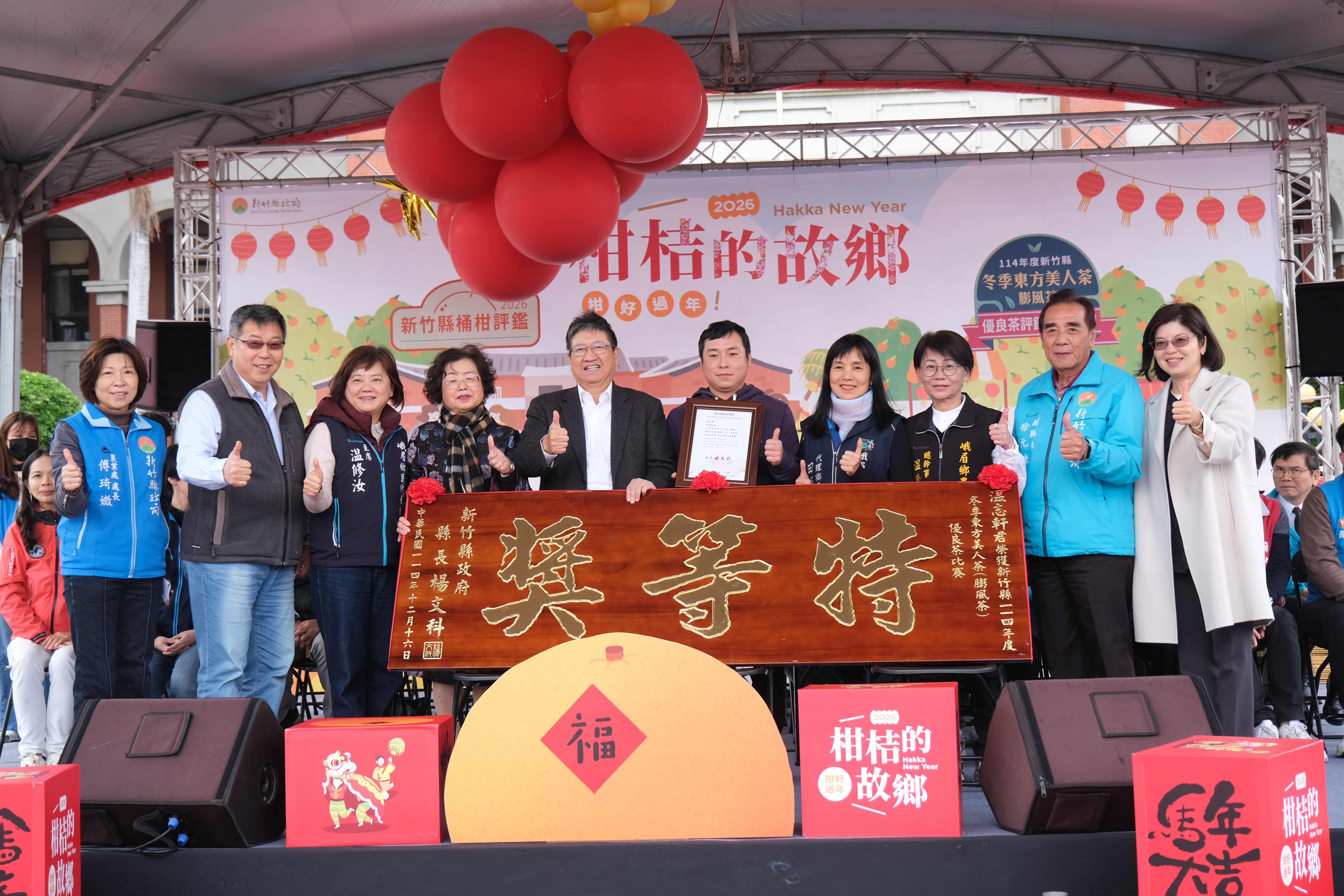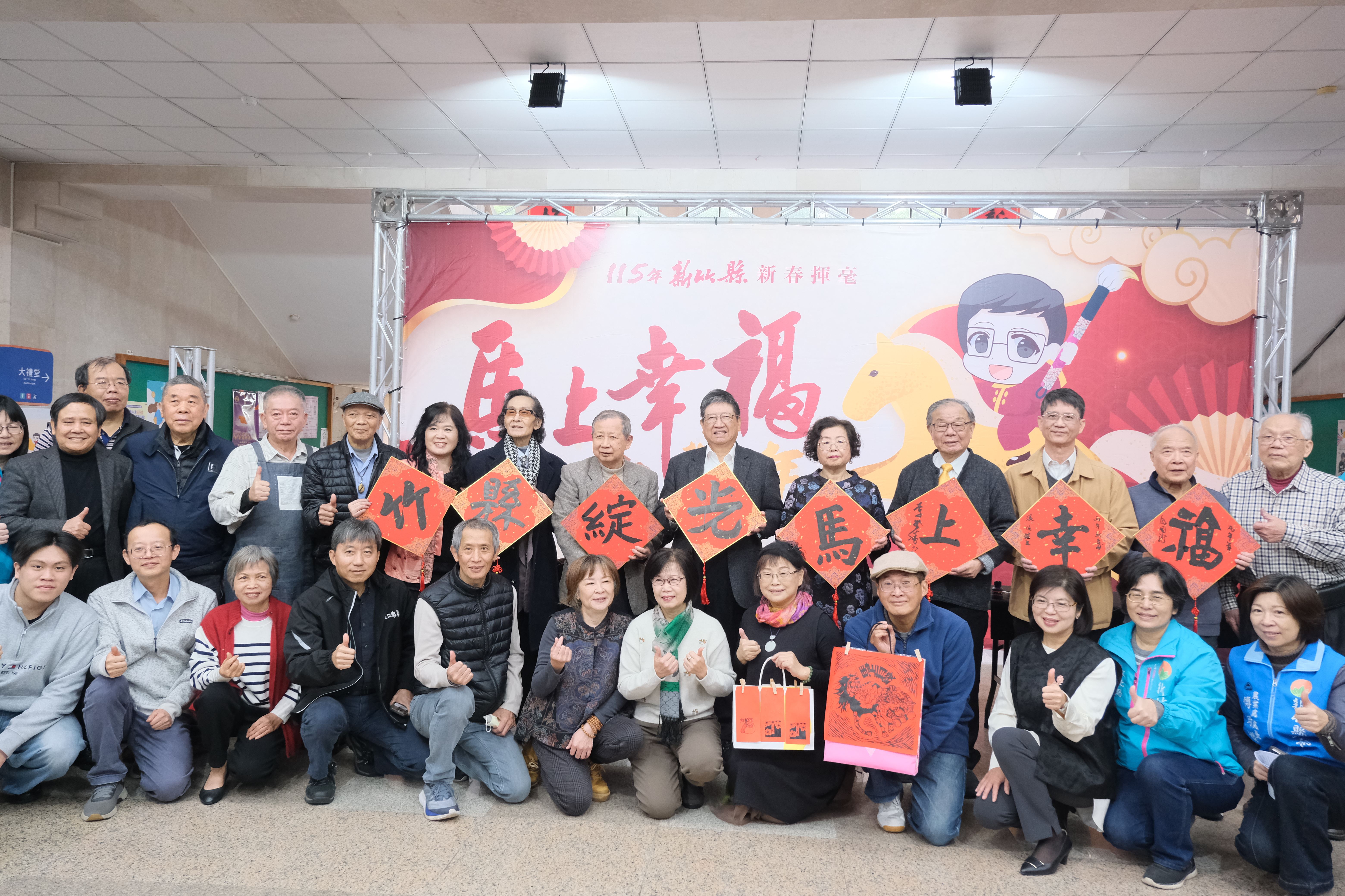 為迎接農曆新年,並推廣新竹縣在地優良柑桔,縣府今(7日)起一連兩天於縣府前廣場舉辦「2026 新竹縣柑桔的故鄉-柑好過年 Hakka New Year」產業文化活動,並於縣府大廳舉辦「馬上幸福迎豐年-115年竹縣春聯揮毫活動」,縣長楊文科與書法名家現場揮毫寫下「竹縣綻光 馬上幸福」,並提供春聯索取與年畫、紅包袋拓印DIY,吸引大批民眾排隊索取,現場氣氛熱鬧滾滾。