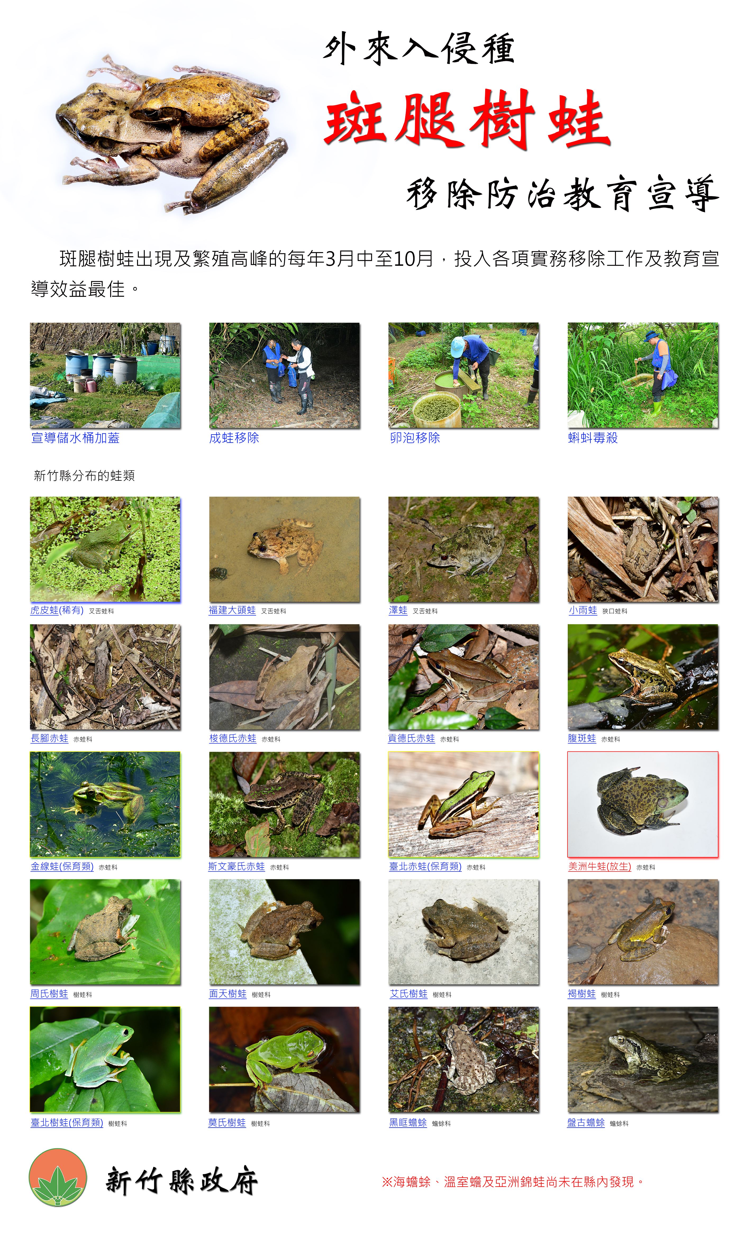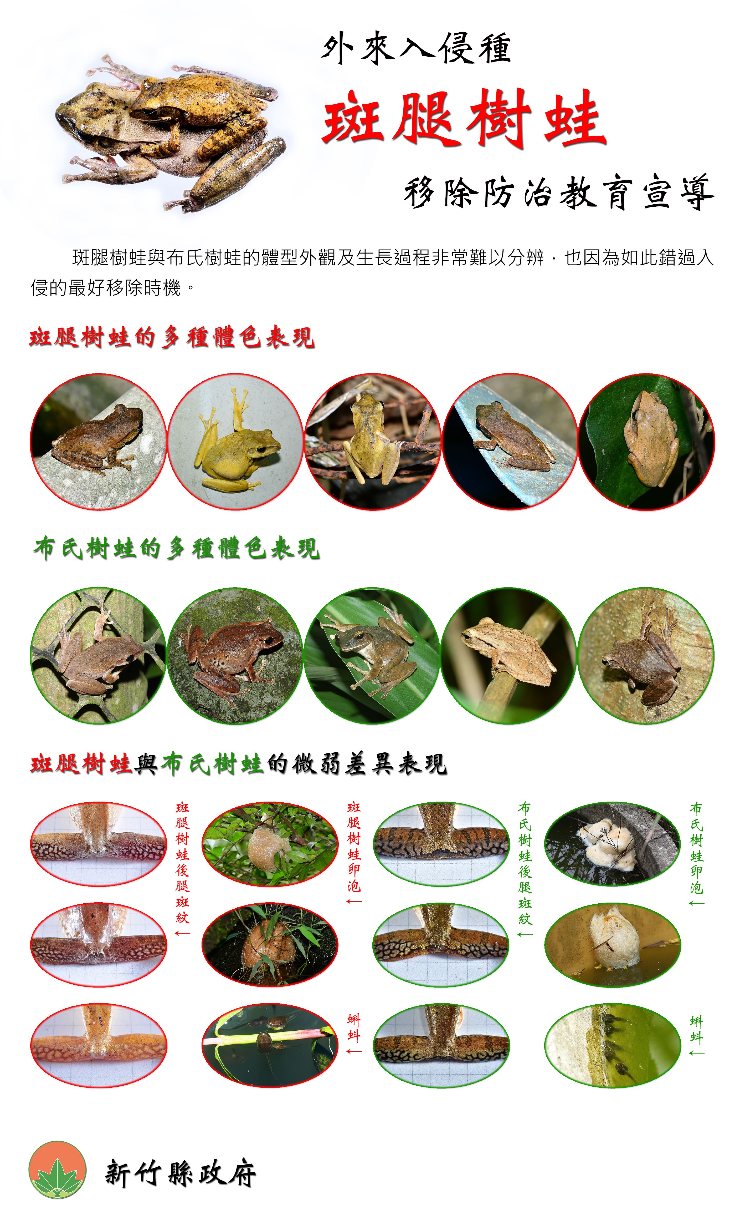 新竹縣外來種斑腿樹蛙防治宣導摺頁、看板